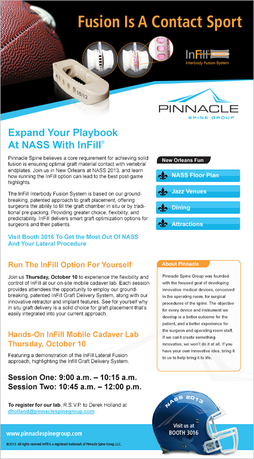 With one of the world’s largest spine conferences approaching, this innovative spine device company wanted to connect with attendees to announce it would be exhibiting at the show. The company also wanted to promote a hands-on product demonstration of its key technology, during two sessions of an onsite, mobile cadaver lab. Leveraging the messaging we developed for the company’s website and print ad, LSHD created an engaging email that focuses on the primary innovation—in situ delivery of graft material. The game changing nature of the technology provided the hook for the “Fusion is a Contact Sport” email and helped to drive traffic to both the booth and lab.