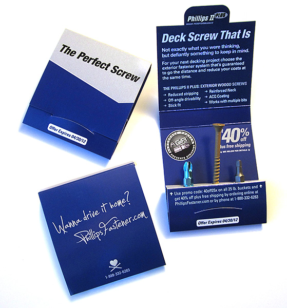 This leader in fastener technology wanted to impress buyers at two national hardware chains by generating sales for its Phillips II Plus exterior wood screw. The plan was to target deck builders in North Carolina and provide them a sales code for 40% off the online purchase of a 25 lb. box. To ensure the offer wasn’t overlooked, LSHD designed a tongue-in-cheek dimensional mailer that let recipients know finding the perfect (deck) screw was easier than they thought. In fact, it was right in their hands. The mailer included a sample screw for builders to try, while the “handwritten” message on the back cover directed them to a url to learn more.