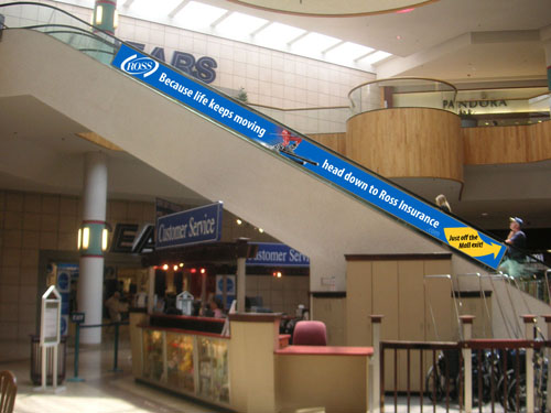 This local insurance agency was looking for a way to connect with prospects and get them thinking about insurance options, as well as about the company itself. With its office less than a mile away from one of the area’s largest malls, we utilized an unexpected, public approach. LSHD’s escalator wraps were designed to be funny, yet informative conversation starters, and were placed on the escalators at the center of the mall for maximum visibility. Angled in such a way that the people riding the escalator “completed” the image, the wraps’ messaging leveraged the company’s positioning, as well as proximity to the mall, to encourage viewers to get in touch with the company.