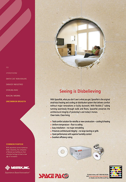 This industry’s leader in small-duct systems is known for delivering all the benefits of central air without costly renovations, unsightly ductwork, or loss of useable living space. A recent product addition had broadened its solution capacity even further, and provided the company with a perfect reason to re-engage with its core audience and remind them what the system is all about. To that end, LSHD developed a small but effective campaign that positioned the system as the (hidden) secret behind comfortable living and working spaces. The ad also helps contractors retell the SpacePak story to homeowners interested in an effective, efficient way to keep their homes comfortable all year long.