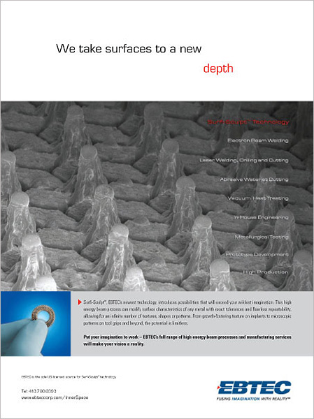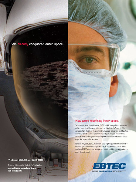 Looking to get a foothold in the medical device manufacturing market, this leader in high-energy-beam fabrication wanted an in-channel ad that would resonate with the target audience. Leveraging its 30-plus years of proven aerospace success, our positioning conveys the company’s heritage, its capabilities, and how these capabilities would translate to the medical sector. “We’ve already conquered outer space. Now we’re redefining inner space.” alludes to the company’s critical work for the Apollo program, suggesting that if this company is capable of the precision manufacturing necessary to get a man to the moon, imagine what it can do for the medical device market.